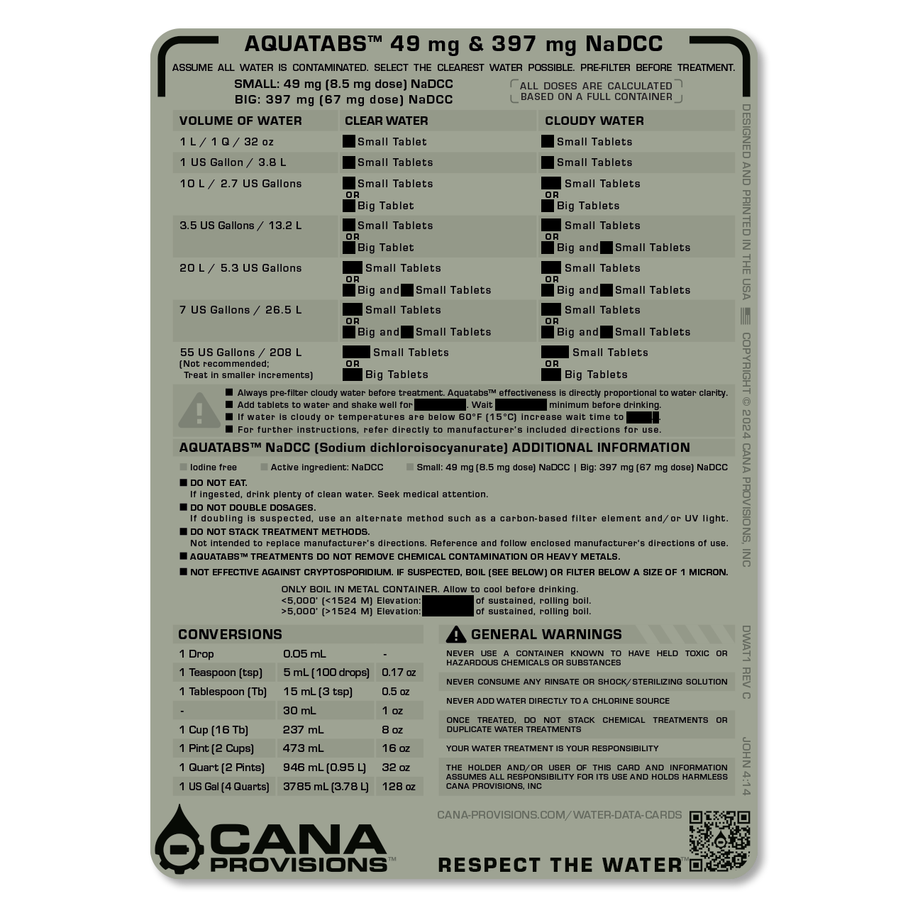 DISCLAIMER/WARNING - THE BLEACH AND IODINE DOSAGES PROVIDED ON THE WATER DATA CARD FAMILY OF PRODUCTS ARE IN ACCORDANCE AND ALIGNMENT WITH THE DOSAGES AS RECOMMENDED BY THE CDC AND EPA FOR SAFE WATER PREPARTION. PLEASE NOTE THAT THESE CONCENTRATIONS AND DOSES ARE CONSIDERABLY HIGHER THAN OTHER MANUFACTURED OPTIONS (AQUATABS, AQUAMIRA, H2GO) AND SHOULD BE TREATED ACCORDINGLY. CANA PROVISONS DOES NOT RECOMMEND THE USE OF HOUSEHOLD BLEACH AS YOUR PRIMARY WATER TREATMENT METHOD DUE TO THE VARYING CONCENTRATIONS OF BLEACH AND ITS DEGREDATION/DECOMPOSITION OVER TIME. FOLLOW ALL MANUFACTURER’S DIRECTIONS AND PERSONAL PROTECTIVE EQUIPMENT (PPE) FOR THE SAFE HANDLING OF BLEACH. DO NOT DRINK BLEACH. YOUR WATER TREATMENT IS YOUR RESPONSIBILITY.