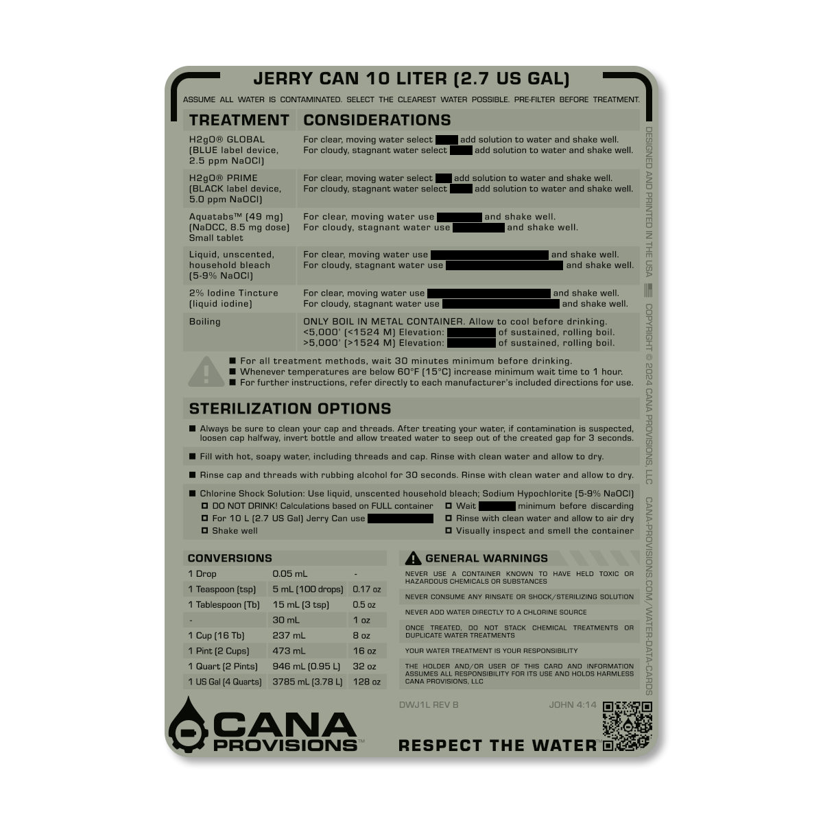 DISCLAIMER/WARNING - THE BLEACH AND IODINE DOSAGES PROVIDED ON THE WATER DATA CARD FAMILY OF PRODUCTS ARE IN ACCORDANCE AND ALIGNMENT WITH THE DOSAGES AS RECOMMENDED BY THE CDC AND EPA FOR SAFE WATER PREPARTION. PLEASE NOTE THAT THESE CONCENTRATIONS AND DOSES ARE CONSIDERABLY HIGHER THAN OTHER MANUFACTURED OPTIONS (AQUATABS, AQUAMIRA, H2GO) AND SHOULD BE TREATED ACCORDINGLY. CANA PROVISONS DOES NOT RECOMMEND THE USE OF HOUSEHOLD BLEACH AS YOUR PRIMARY WATER TREATMENT METHOD DUE TO THE VARYING CONCENTRATIONS OF BLEACH AND ITS DEGREDATION/DECOMPOSITION OVER TIME. FOLLOW ALL MANUFACTURER’S DIRECTIONS AND PERSONAL PROTECTIVE EQUIPMENT (PPE) FOR THE SAFE HANDLING OF BLEACH. DO NOT DRINK BLEACH. YOUR WATER TREATMENT IS YOUR RESPONSIBILITY.