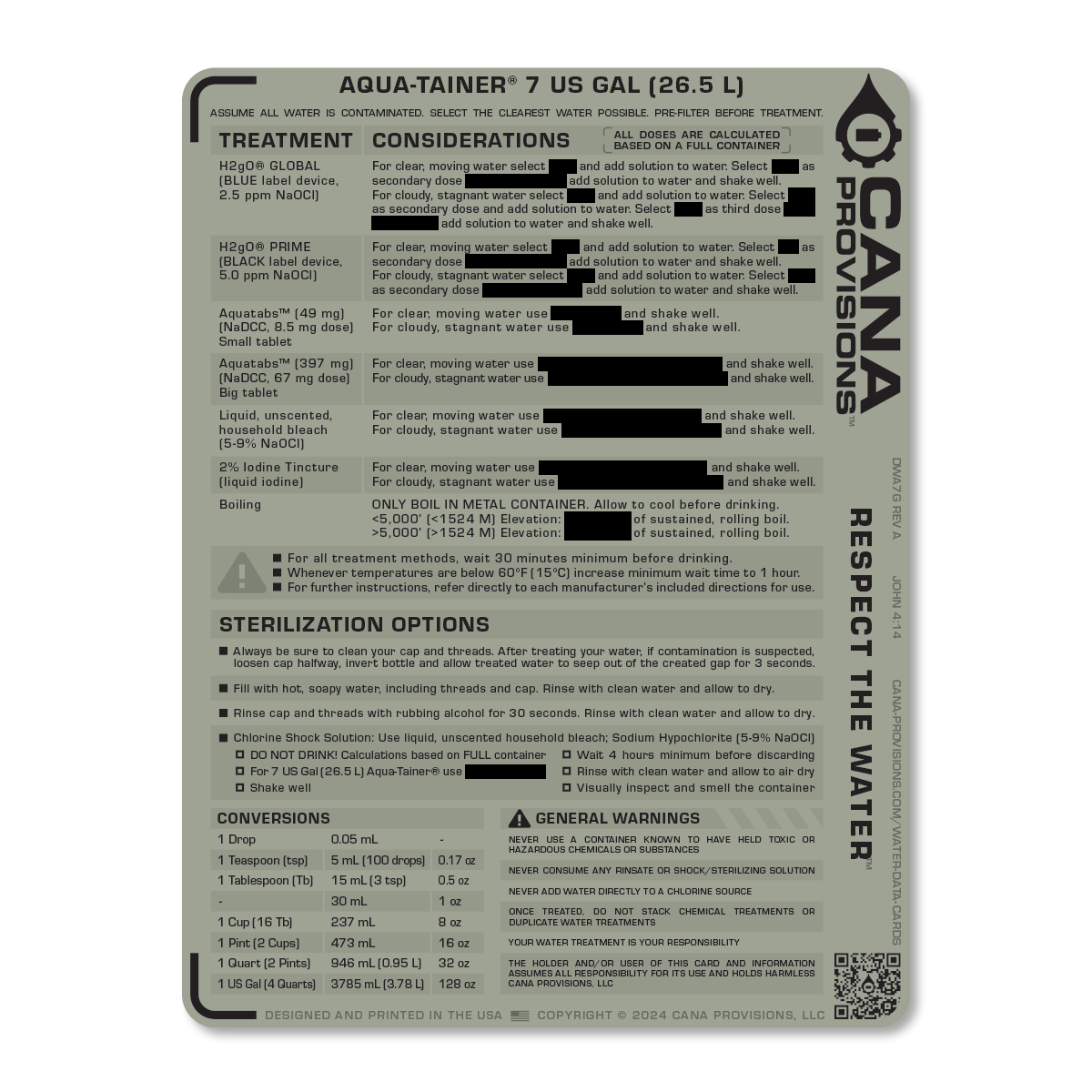 DISCLAIMER/WARNING - THE BLEACH AND IODINE DOSAGES PROVIDED ON THE WATER DATA CARD FAMILY OF PRODUCTS ARE IN ACCORDANCE AND ALIGNMENT WITH THE DOSAGES AS RECOMMENDED BY THE CDC AND EPA FOR SAFE WATER PREPARTION. PLEASE NOTE THAT THESE CONCENTRATIONS AND DOSES ARE CONSIDERABLY HIGHER THAN OTHER MANUFACTURED OPTIONS (AQUATABS, AQUAMIRA, H2GO) AND SHOULD BE TREATED ACCORDINGLY. CANA PROVISONS DOES NOT RECOMMEND THE USE OF HOUSEHOLD BLEACH AS YOUR PRIMARY WATER TREATMENT METHOD DUE TO THE VARYING CONCENTRATIONS OF BLEACH AND ITS DEGREDATION/DECOMPOSITION OVER TIME. FOLLOW ALL MANUFACTURER’S DIRECTIONS AND PERSONAL PROTECTIVE EQUIPMENT (PPE) FOR THE SAFE HANDLING OF BLEACH. DO NOT DRINK BLEACH. YOUR WATER TREATMENT IS YOUR RESPONSIBILITY.