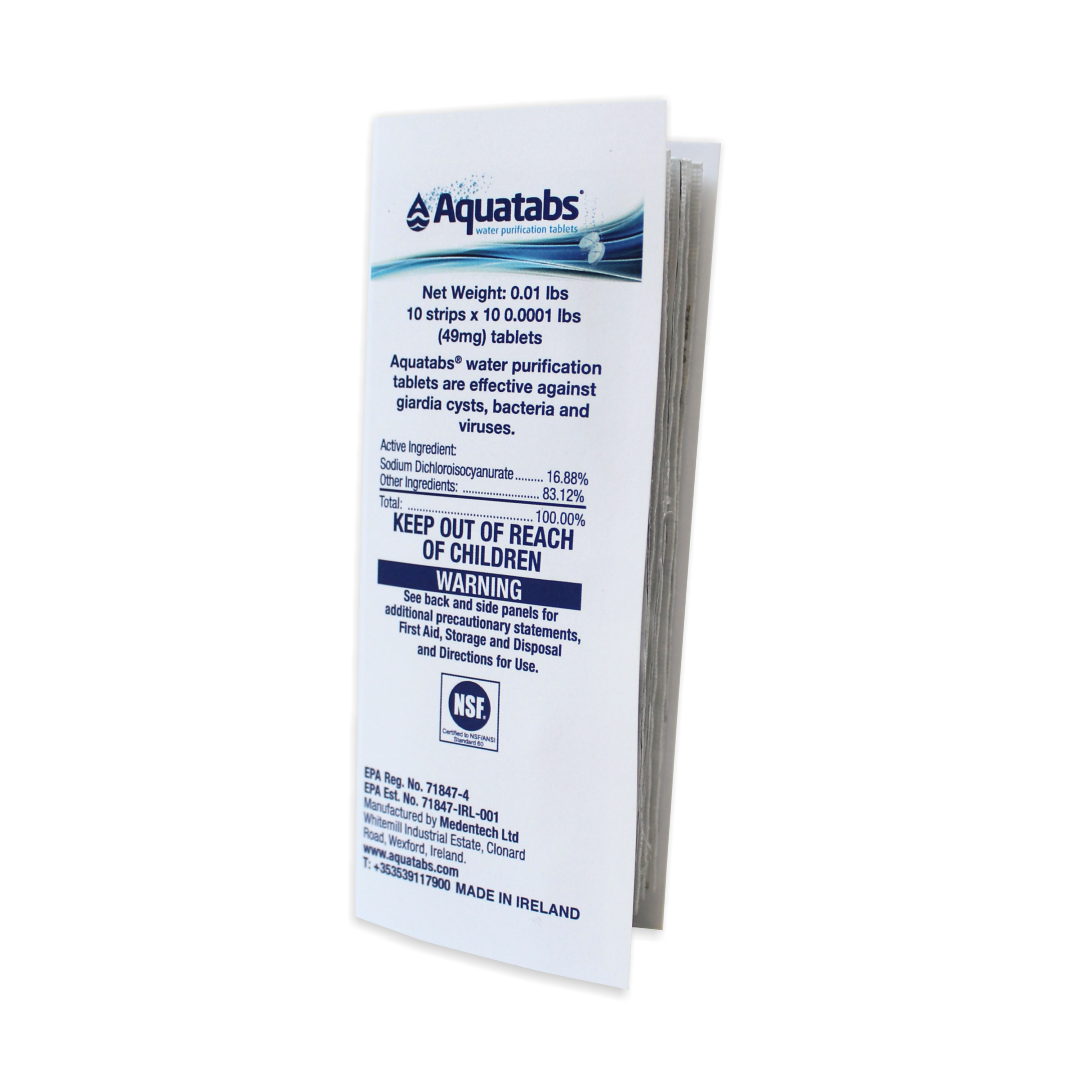 Aquatabs is a purifying tablet which is added to drinking water to kill harmful micro-organisms. The tablet quickly dissolves and disinfects water in 30 minutes. Each tablet can treat up to 64 ounces of water. Expiration date: April 2027.