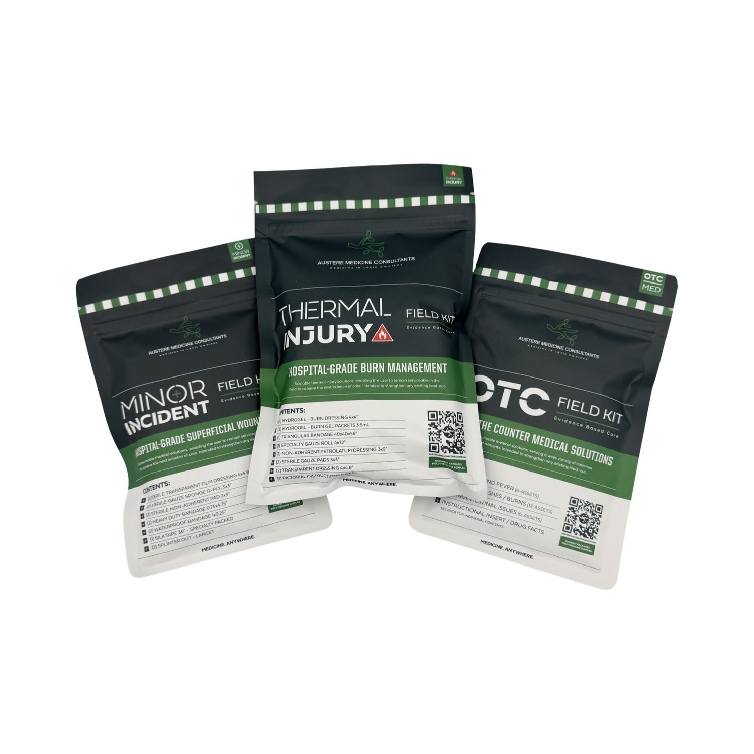 Developed with input from Special Forces 18D, Ranger Medics, and other medical authorities, the Minor Incident Field Kit, Thermal Injury Field Kit, and the Over the Counter Field Kit (OTC) are designed to keep you in the fight. Not too big, not too small, but just right. These American developed and assembled, durably packaged medical solutions contain hospital-grade supplies to address superficial wounds enabling the user to stay serviceable in the field by securing a wound and pushing on to the next echelon of care. These kits are meant to be consumable assets that the end-user can add to any existing load-out, throw in a bag or pocket for a quick day hike, or keep in a carry-on on your travels. MEDICINE. ANYWHERE.