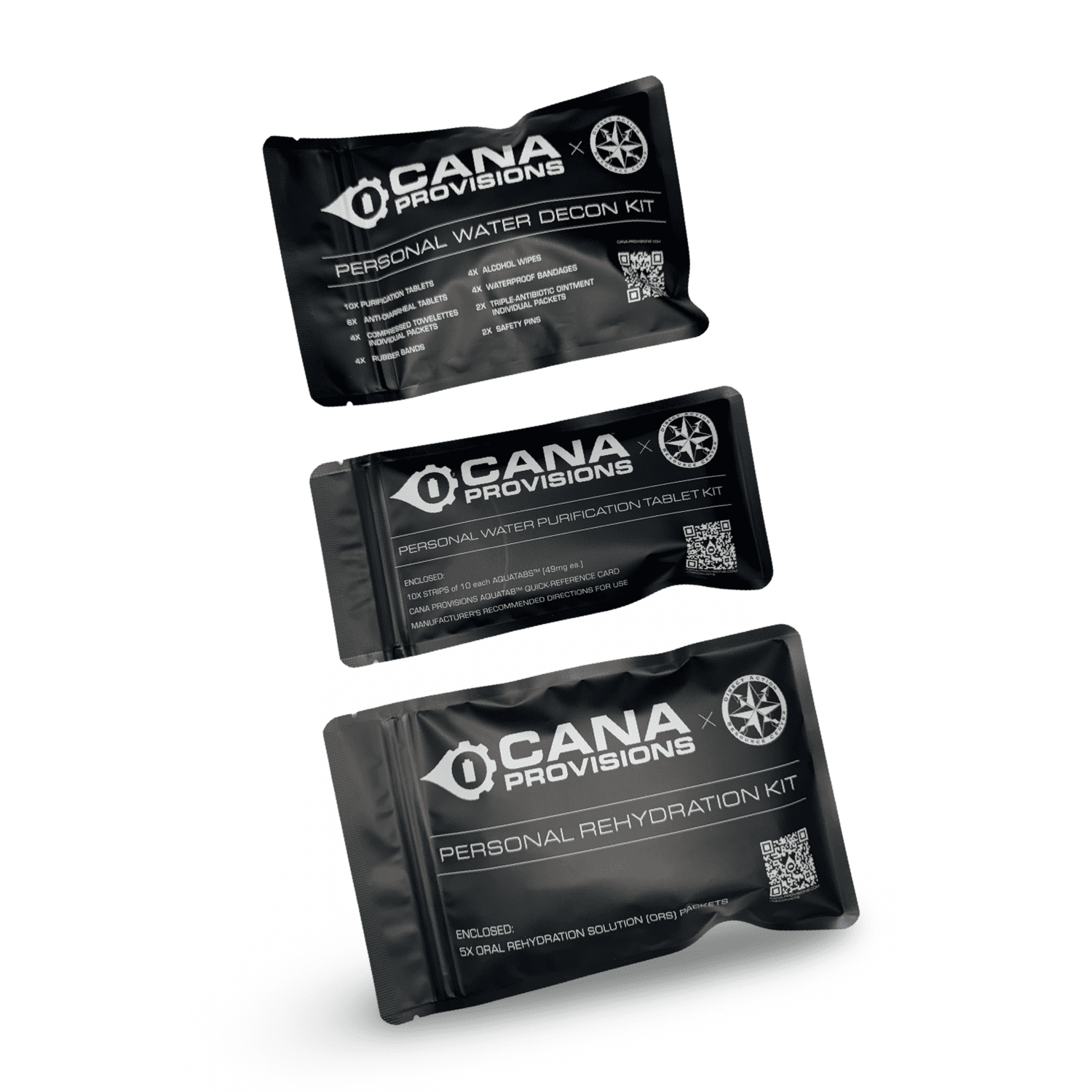 All of our personal water decon kit variants wrapped into one convenient package. One original water decon kit, one rehydration kit, and one personal water purification kit all packaged in one of our signature resealable windowed bags.