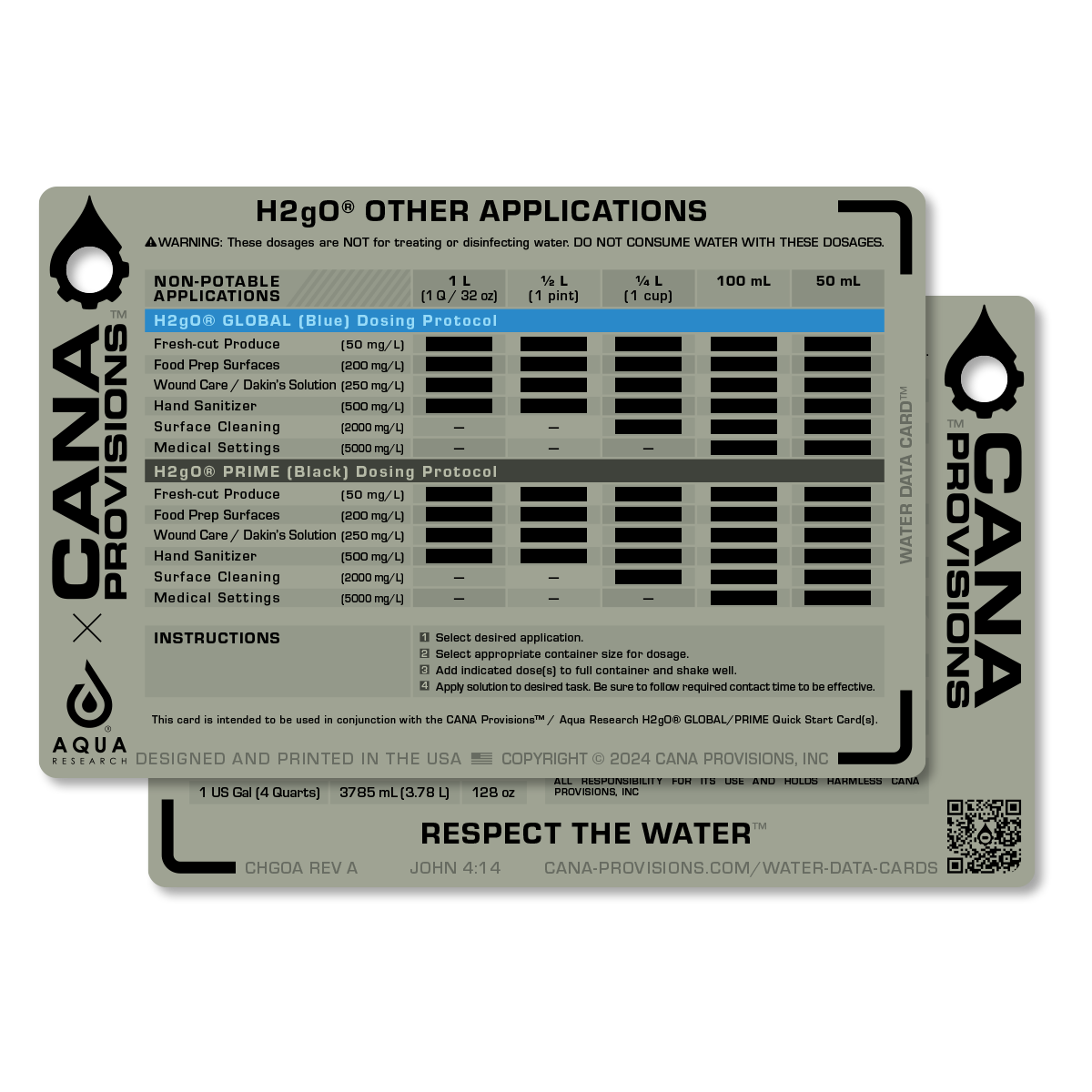 Produced in conjunction with Aqua Research and available only at Cana Provisions, the H2gO other application Water Data Card is manufactured to the same tight standards and form factor as the rest of the water data card family. Designed to be directly integrated with your other water data cards, it contains all the instructions for making concentrations useful for a multitude of other tasks beyond disinfecting water.