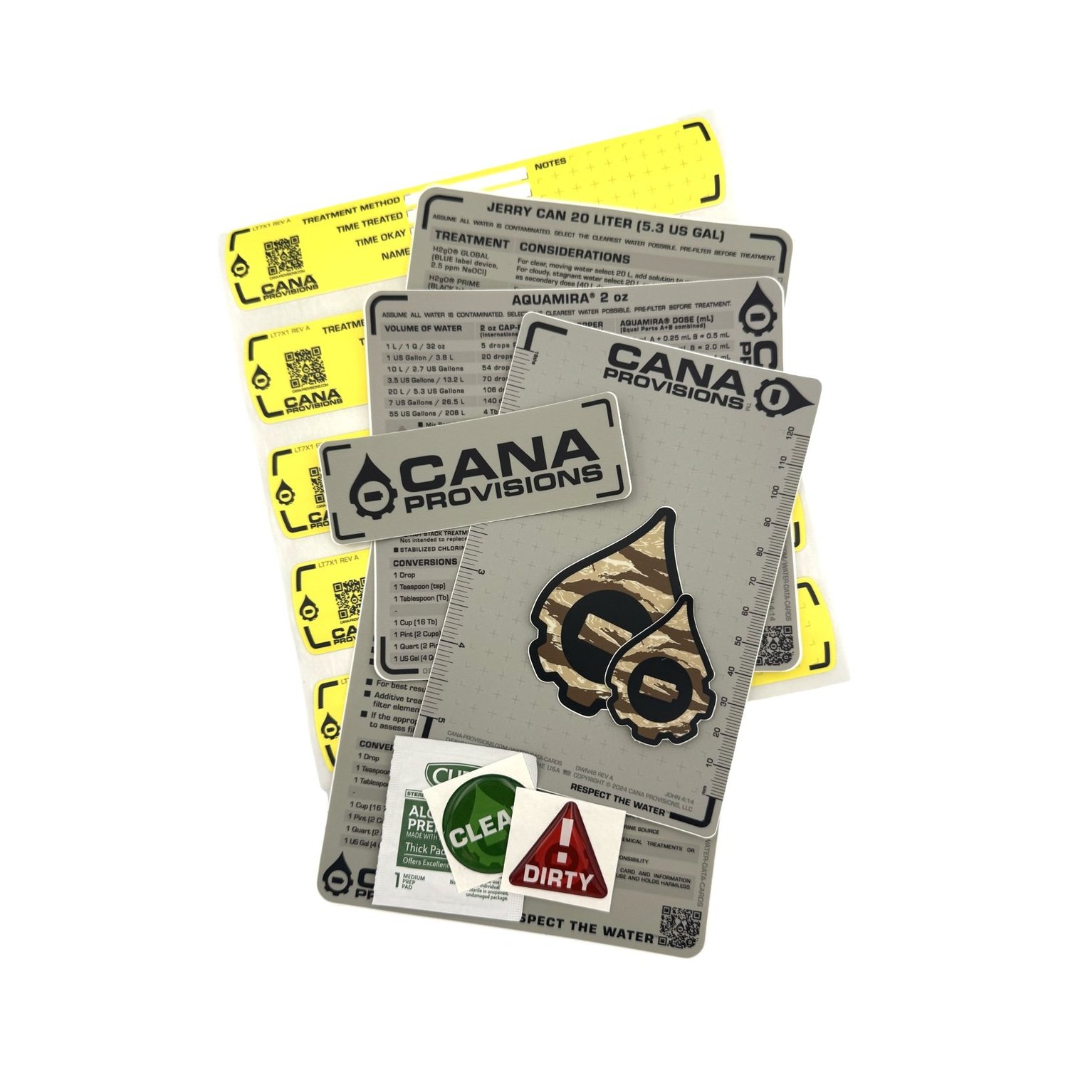 DISCLAIMER/WARNING - THE BLEACH AND IODINE DOSAGES PROVIDED ON THE WATER DATA CARD FAMILY OF PRODUCTS ARE IN ACCORDANCE AND ALIGNMENT WITH THE DOSAGES AS RECOMMENDED BY THE CDC AND EPA FOR SAFE WATER PREPARTION. PLEASE NOTE THAT THESE CONCENTRATIONS AND DOSES ARE CONSIDERABLY HIGHER THAN OTHER MANUFACTURED OPTIONS (AQUATABS, AQUAMIRA, H2GO) AND SHOULD BE TREATED ACCORDINGLY. CANA PROVISONS DOES NOT RECOMMEND THE USE OF HOUSEHOLD BLEACH AS YOUR PRIMARY WATER TREATMENT METHOD DUE TO THE VARYING CONCENTRATIONS OF BLEACH AND ITS DEGREDATION/DECOMPOSITION OVER TIME. FOLLOW ALL MANUFACTURER’S DIRECTIONS AND PERSONAL PROTECTIVE EQUIPMENT (PPE) FOR THE SAFE HANDLING OF BLEACH. DO NOT DRINK BLEACH. YOUR WATER TREATMENT IS YOUR RESPONSIBILITY.